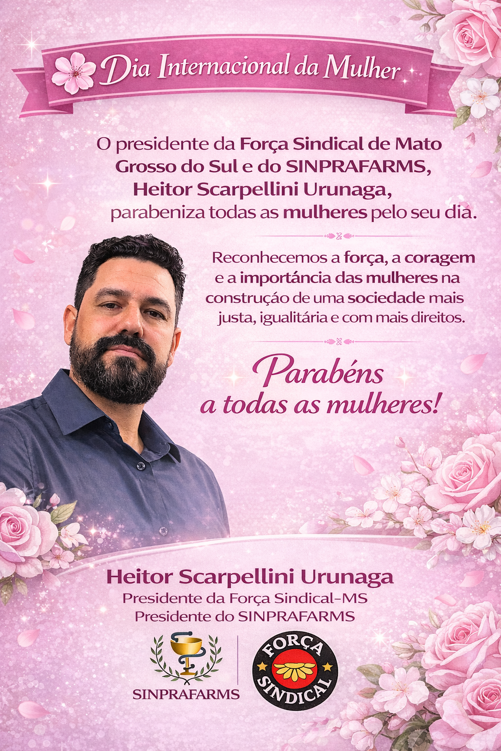 O presidente da Força Sindical de Mato Grosso do Sul e do SINPRAFARMS, Heitor Scarpellini Urunaga, parabeniza todas as mulheres pelo seu dia, reconhecendo sua força, coragem, dedicação e a importância de sua luta por igualdade, respeito e direitos. Que este dia seja também um momento de reflexão, valorização e fortalecimento da luta por uma sociedade mais justa e igualitária para todas as mulheres. ? Parabéns a todas as mulheres! • Veja outras informações |