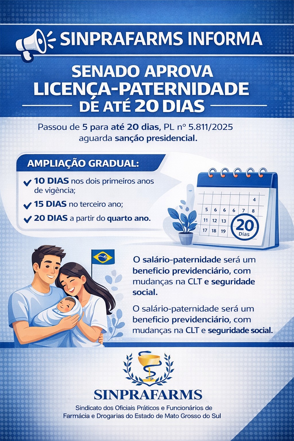 Notícias12/03/2026 Senado Federal aprova ampliação da licença-paternidade de 5 para até 20 diasO Senado Federal aprovou, nesta quarta-feira (04/03), a ampliação da licença-paternidade de 5 para até 20 dias. O Projeto de Lei nº 5.811/2025, apresentado pela ex-senadora Patrícia Saboya e relatado pela senadora Ana Paula Lobato, segue agora para sanção presidencial. A proposta regulamenta um direito previsto na Constituição Federal de 1988, que até hoje permanecia limitado ao prazo transitório de cinco dias. O projeto cria o salário-paternidade como benefício previdenciário e promove alterações na CLT e nas normas da seguridade social, com o objetivo de ampliar a proteção à paternidade e fortalecer o cuidado compartilhado com os filhos. O texto também prevê a possibilidade de divisão do período de licença. A ampliação será gradual: 10 dias nos dois primeiros anos de vigência da lei; O SINPRAFARMS acompanha atentamente iniciativas que ampliam direitos trabalhistas e reforçam a importância do equilíbrio entre trabalho, família e cuidado com os filhos. • Veja outras informações |